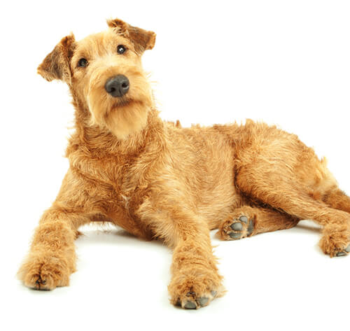 Originally bred to kill vermin on farms, the Irish Terrier is distinguished by his solid red, dense, low-shedding coat and long, tall body. Courageous, loyal and lively, this breed is affectionate with his human companions but aggressive toward other dogs. The athletic Irish Terrier requires regular exercise in a fenced yard and several leashed walks per day.