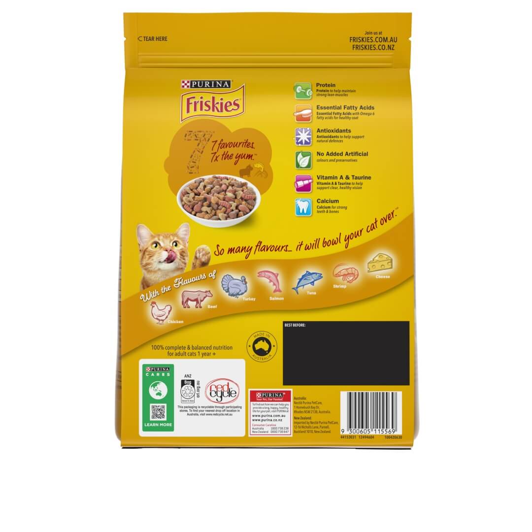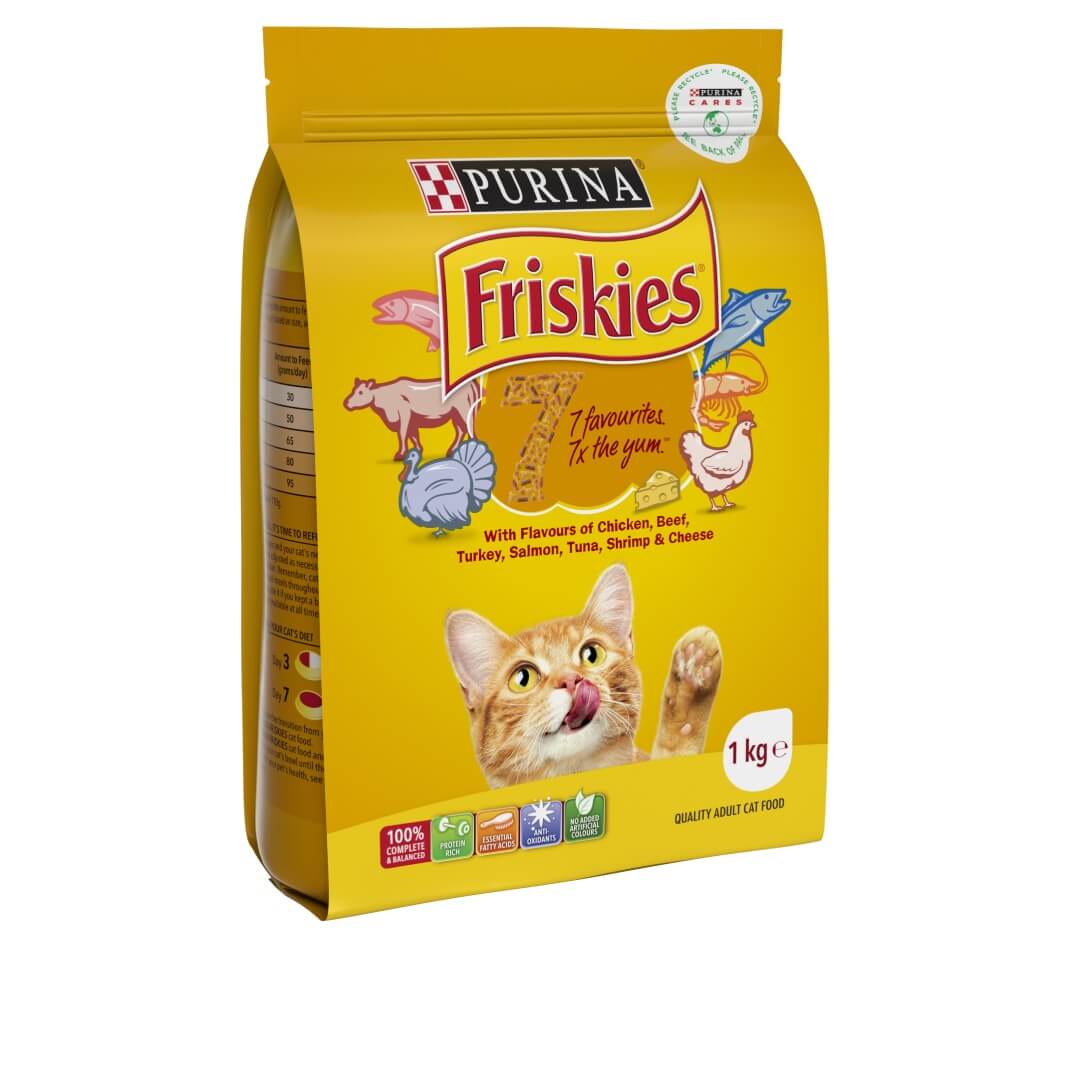 FRISKIES 7® is made up of kibble biscuits in a variety of meat and seafood shapes with the flavours of chicken, beef, turkey, salmon, tuna, shrimp and cheese. 7 of your cats favourite flavours for 7 x the yum. It will bowl your cat over.