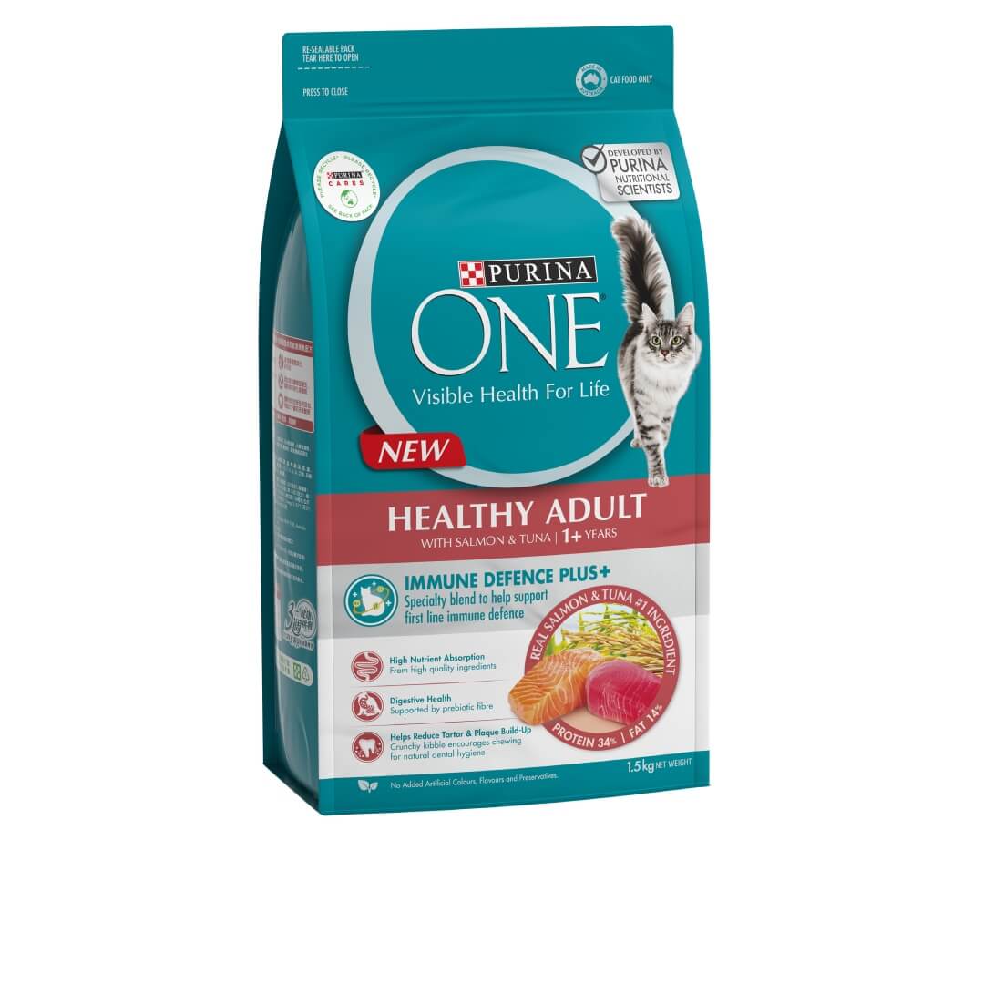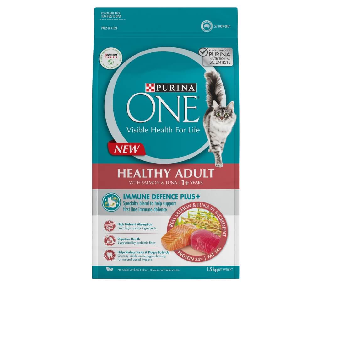PURINA ONE® Healthy Adult with Immune Defence Plus+ contains a specially formulated blend of Vitamins C & E, Omega 3 & 6 and beta glucans, to help support your cat’s natural defences from the inside out.