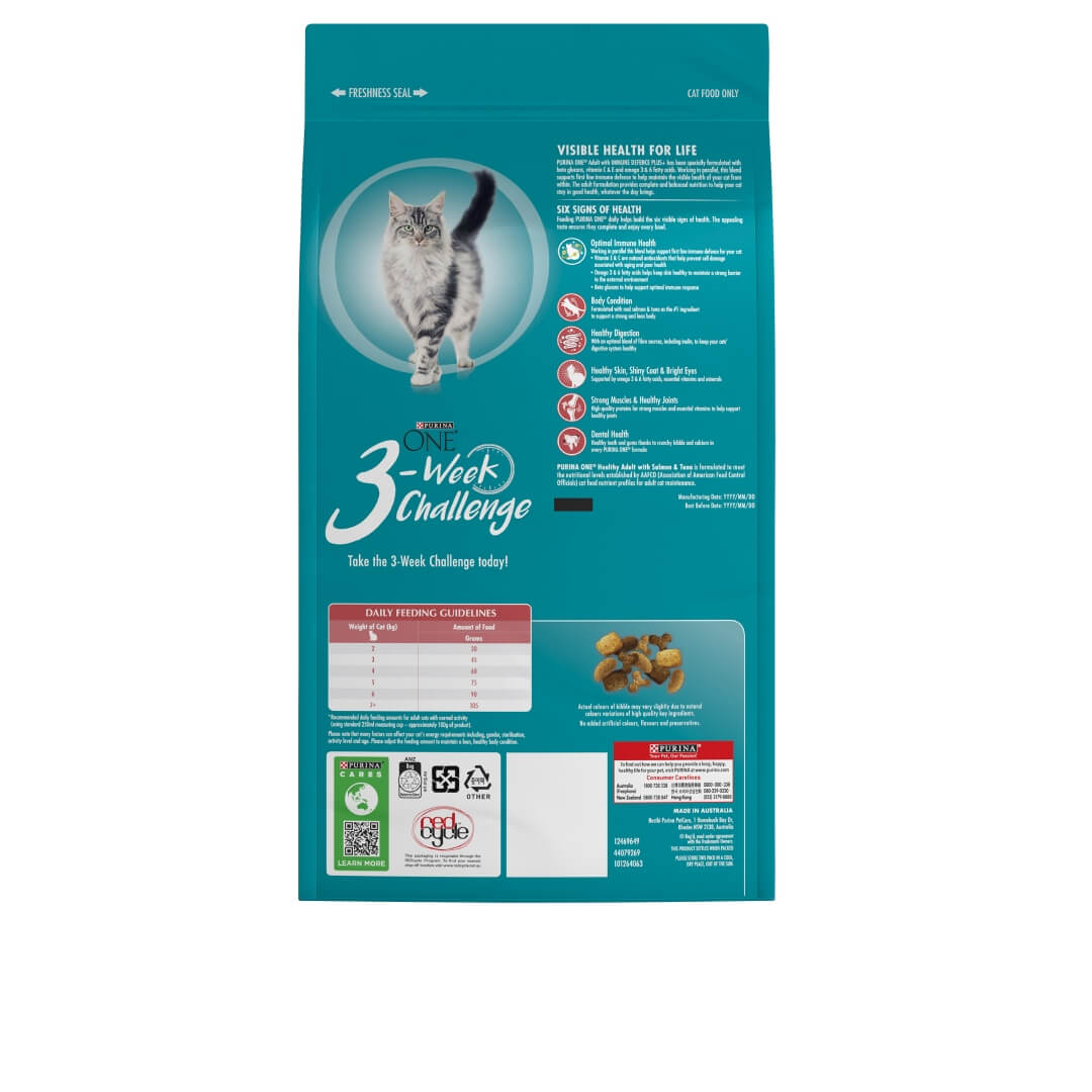 Developed by PURINA Vets and Nutritionists, Purina ONE® Healthy Adult with Immune Defence Plus+ is made with 100% complete and balanced nutrition and contains all the key nutrients your cat needs to help support a healthy life. This recipe is made with real salmon & tuna as the #1 ingredient, because delicious taste combined with superior nutrition is at the heart of your cat’s health and happiness. All our recipes are made with no added artificial colours, flavours and preservatives.