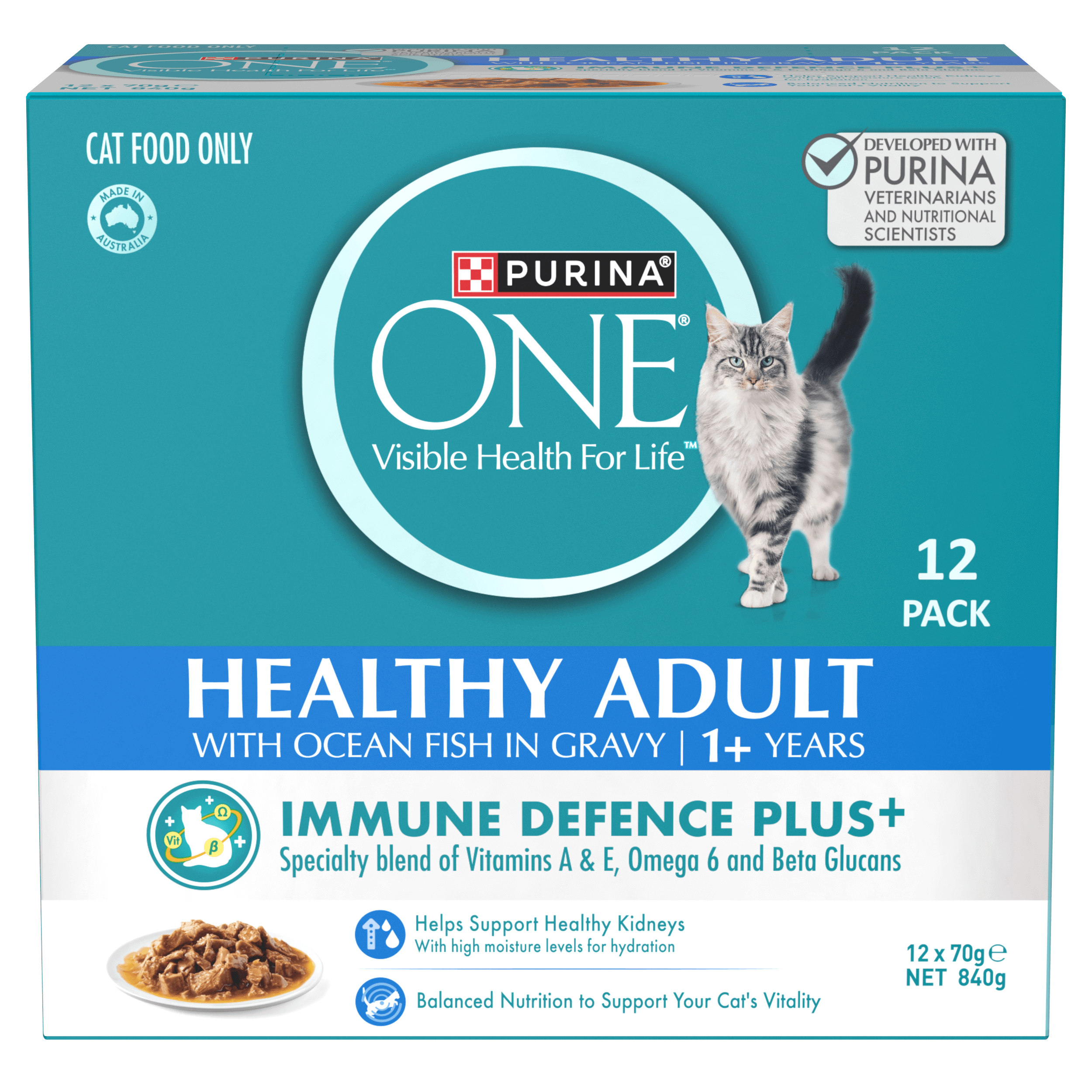 PURINA ONE® Healthy Adult Wet with Ocean Fish is formulated with Immune Defence Plus+, a special blend of Vitamins A & E, Omega 6 and Beta Glucans to help support your cat’s natural defences from the inside out.