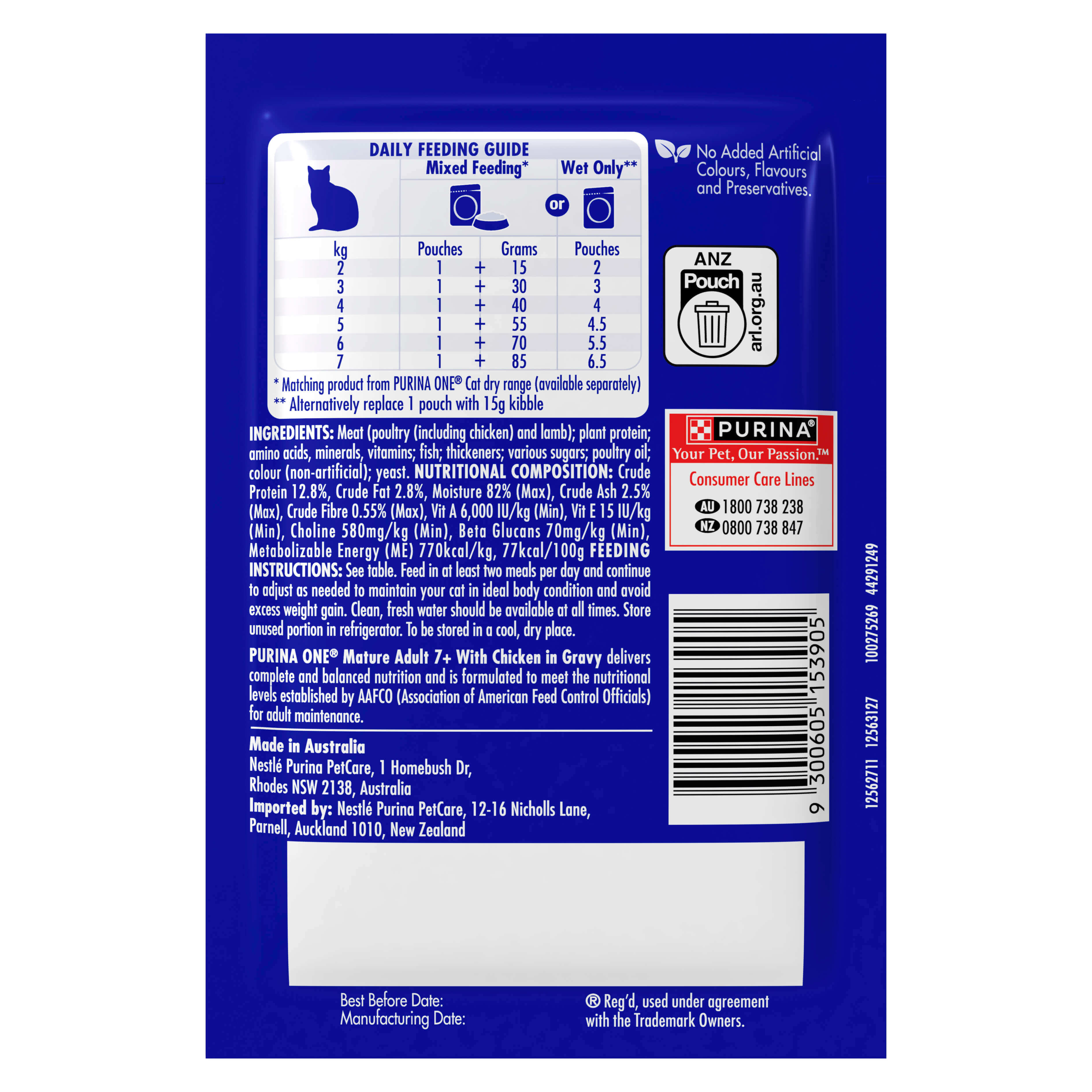 PURINA ONE® Mature Adult Wet now is formulated with Immune Defence Plus+, a special blend of Vitamins A & E, Omega 6 and Beta Glucans to help support your cat’s natural defences from the inside out.