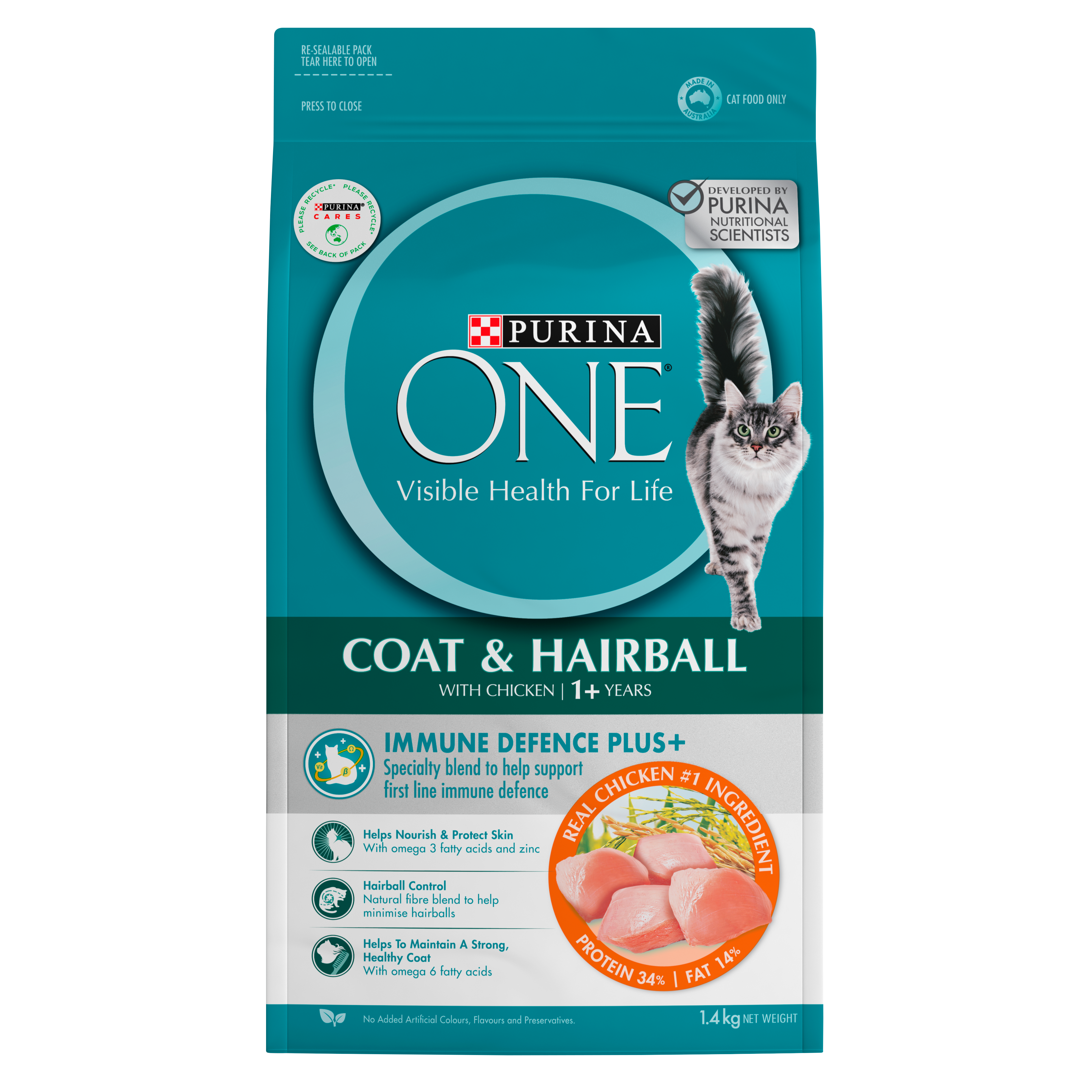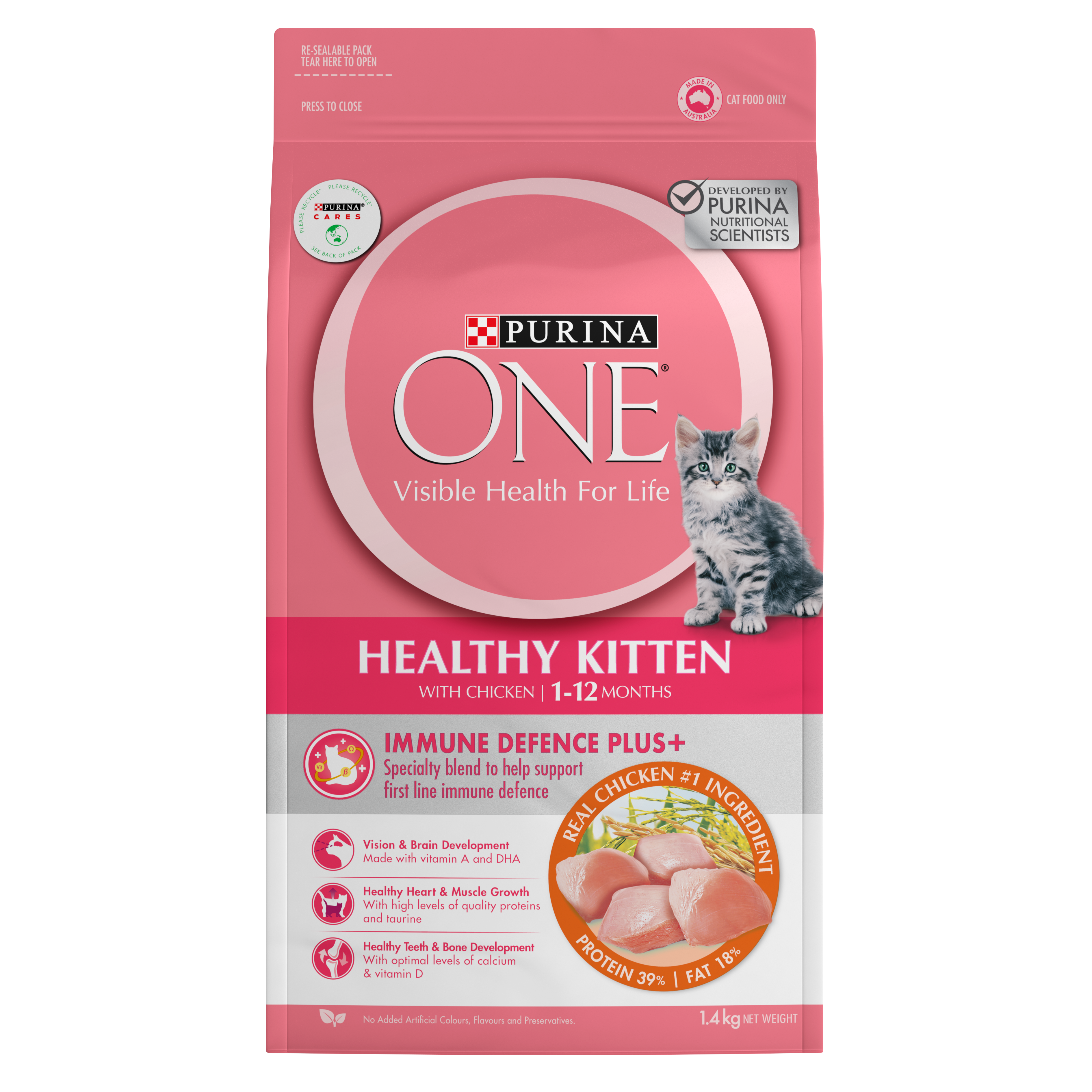 PURINA ONE® KITTEN Dry Active Chicken Kittens are in a phase of intense growth and development and have specific nutritional requirements. PURINA ONE® Healthy Kitten with Immune Defence Plus+ has been specially formulated to answer the nutritional needs of your kitten (from weaning to 12 months) and help to give them the optimal start for a healthy life. It also contains a specially formulated blend of Vitamins C & E, Omega 3 & 6 and beta glucans, to help support your kitten’s natural defences from the inside out. PURINA ONE® is proud to be the SPCA Food of Choice, feeding the cats and dogs of the SPCA with premium nutrition. Developed by PURINA Vets and Nutritionists, Purina ONE® Healthy Kitten with Immune Defence Plus+ is made with 100% complete and balanced nutrition, and real chicken as the #1 ingredient, because delicious taste combined with superior nutrition is at the heart of your kitten’s health and happiness. All our recipes are made with no added artificial colours, flavours and preservatives. Feeding PURINA ONE® daily helps support your kitten’s 6 visible signs of health; body condition, digestion, skin/coat/eyes, immune system, dental health, and bone & joint health. Join our 3 Week Challenge today at https://www.purina.co.nz/registration/three-week-challenge to see a visible difference in your kitten’s health!