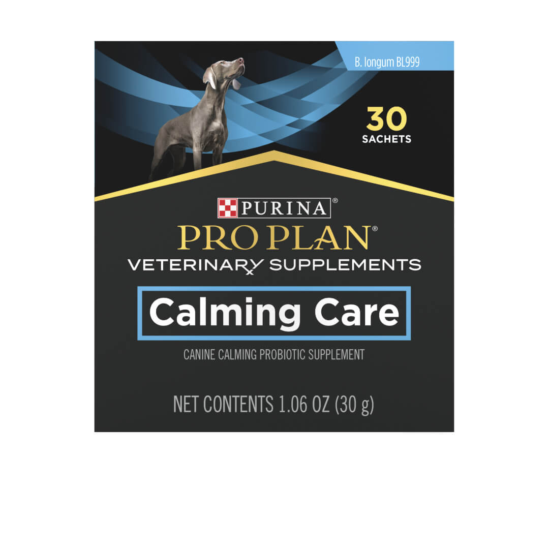 Purina Pro Plan Veterinary Supplements Calming Care a breakthrough in managing dogs exhibiting anxious behaviours. With Bifidobacterium longum (BL999), a probiotic strain shown to help dogs maintain calm behaviour and a positive emotional state. In a blinded crossover design study, 90% of dogs showed an improvement in displaying anxious behaviours such as; jumping, pacing, and spinning