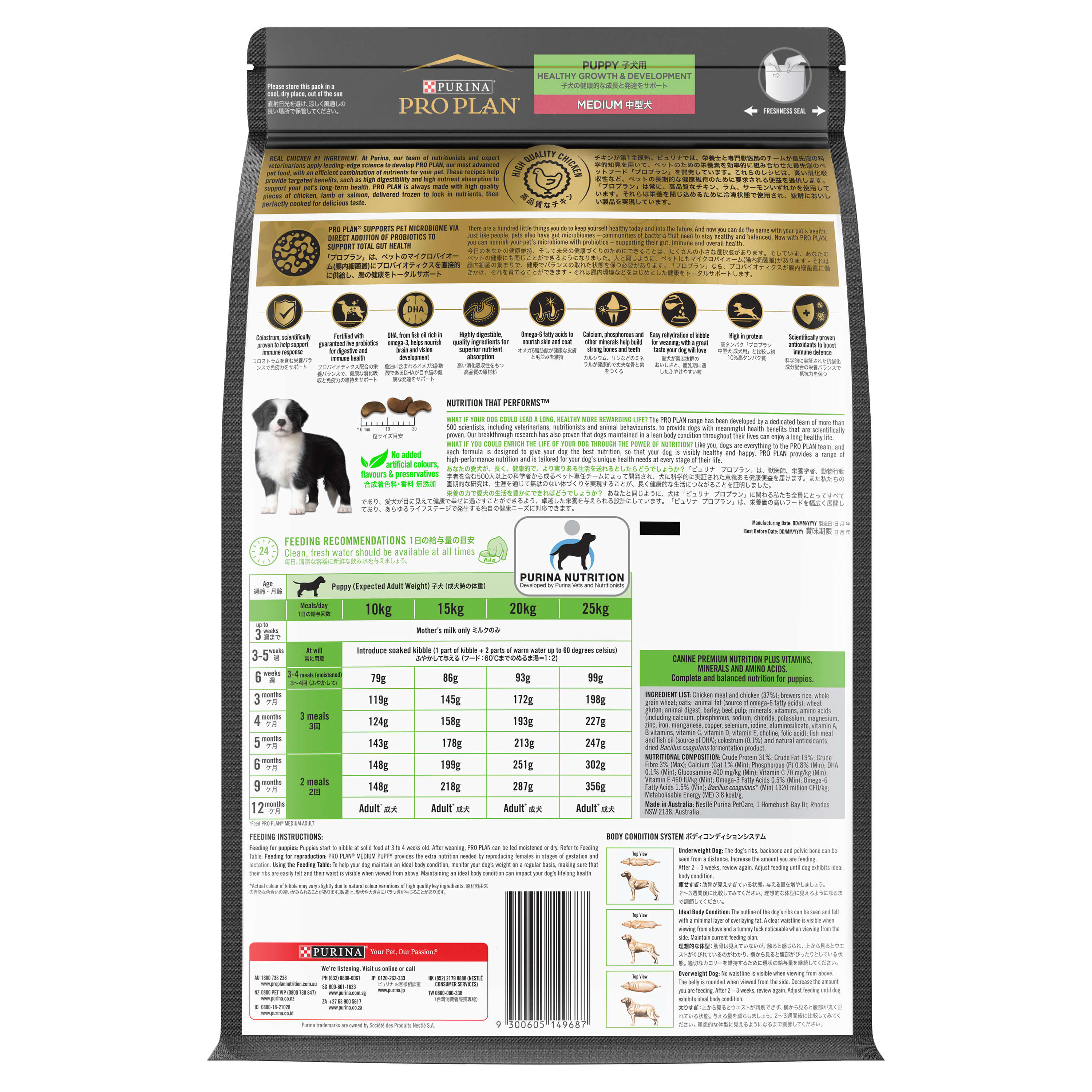 PURINA PRO PLAN Puppy Medium Chicken Formula with Colostrum and Probiotics Dry Dog Food is made with high quality chicken, delivered frozen to lock in nutrients, then perfectly cooked for delicious taste. These recipes help provide targeted benefits, such as high digestibility and high nutrient absorption to support your pet’s long-term health. It is enriched with colostrum, proven to support the immune system of dogs. Now with PRO PLAN, you can nourish your pet’s microbiome with probiotics to support their gut, immune and overall health.