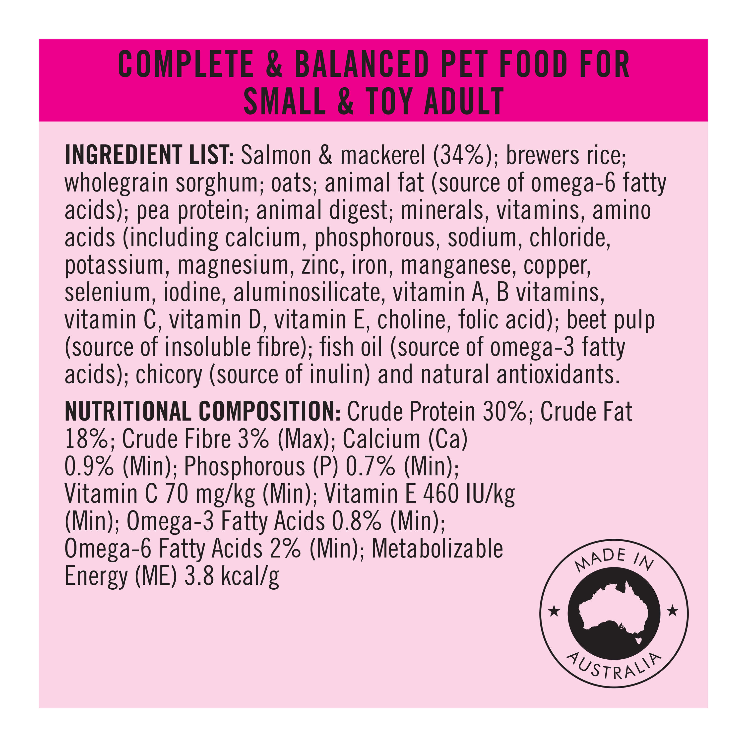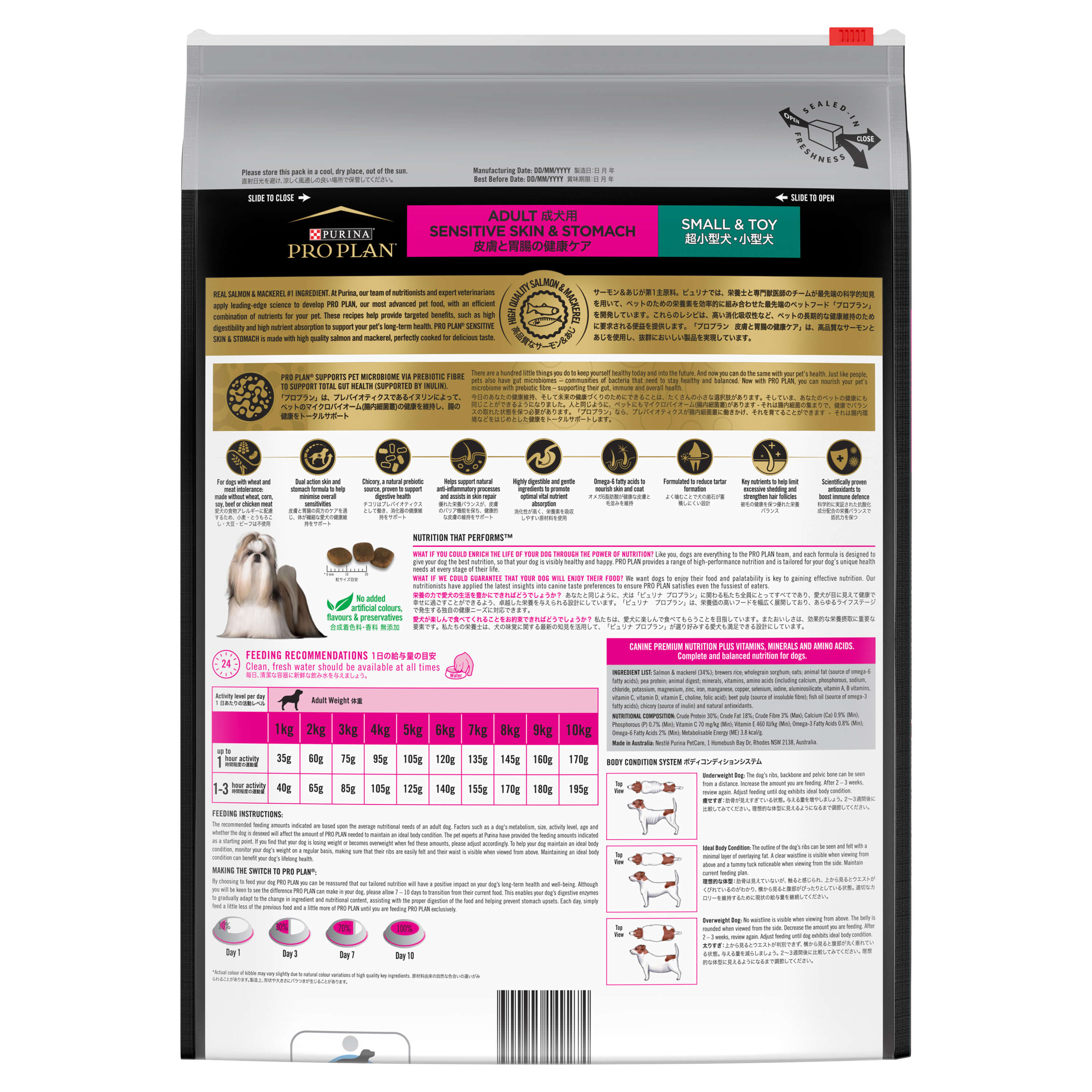 PURINA PRO PLAN Adult Small & Toy Sensitive Skin & Stomach Salmon & Mackerel Formula with Prebiotic Fibre Dry Dog Food is made with high quality salmon and mackerel, delivered frozen to lock in nutrients, then perfectly cooked for delicious taste. These recipes help provide targeted benefits, such as high digestibility and high nutrient absorption to support your pet’s long-term health. Now with PRO PLAN, you can nourish your pet’s microbiome with prebiotic fibre to support their gut, immune and overall health.