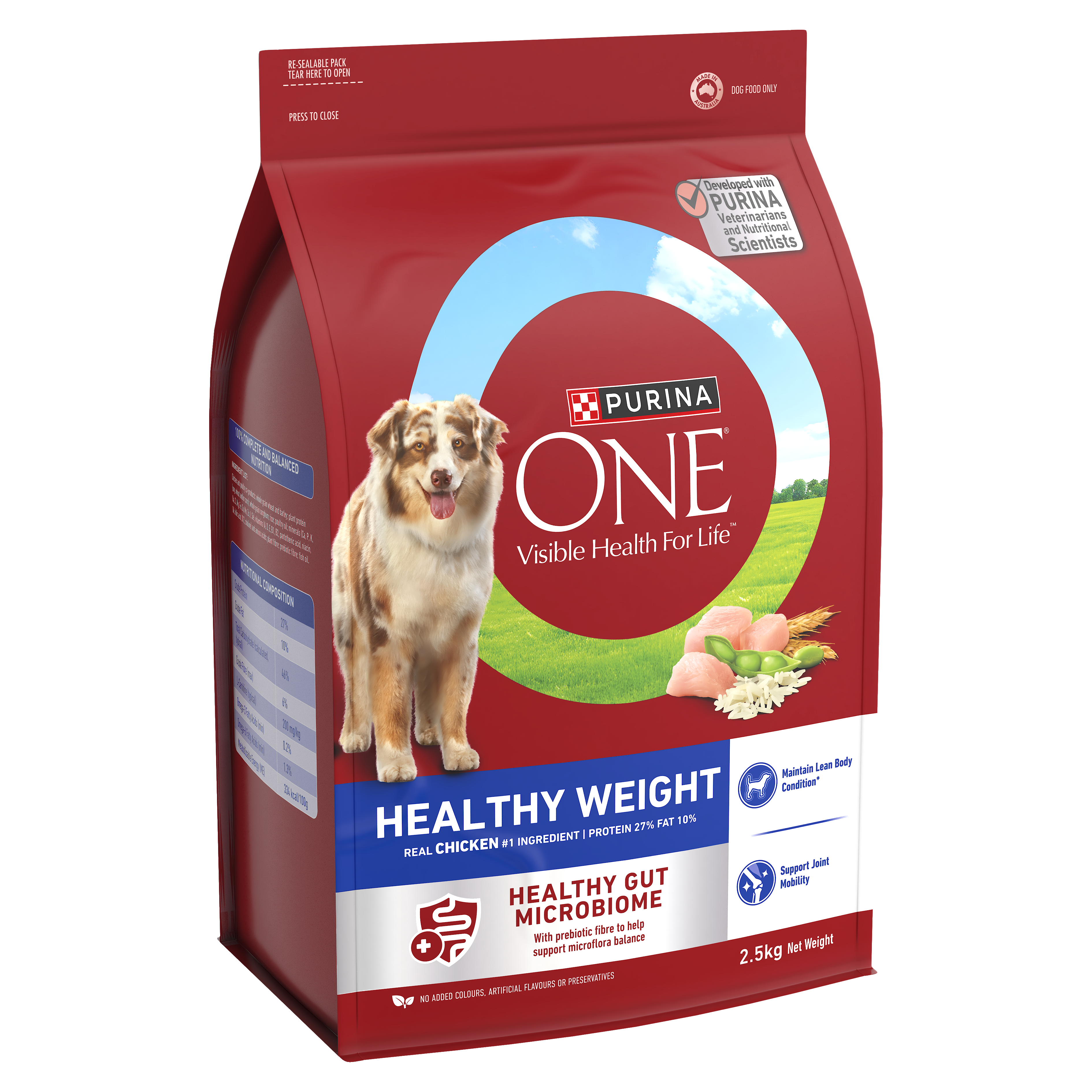 PURINA ONE® Healthy Weight Dry Dog Food is specially formulated to deliver 100% complete & balanced nutrition for your adult dog. Made in Australia with real chicken as the #1 ingredient, and no added colours, artificial flavours, or preservatives, you can be rest assured PURINA ONE® dry dog food is both nutritious and delicious.